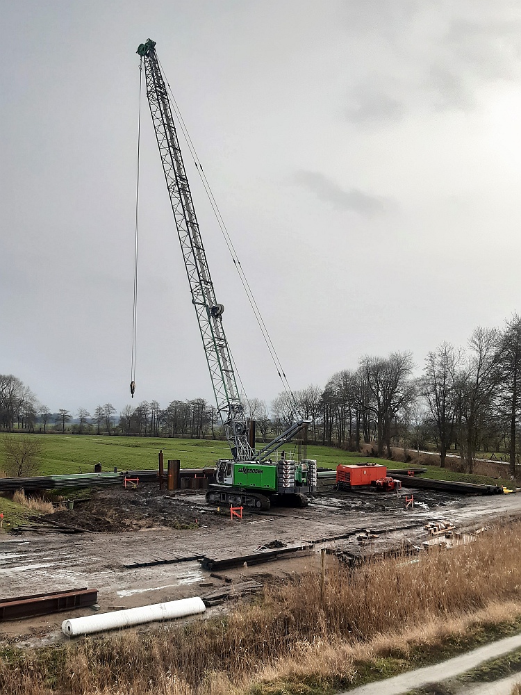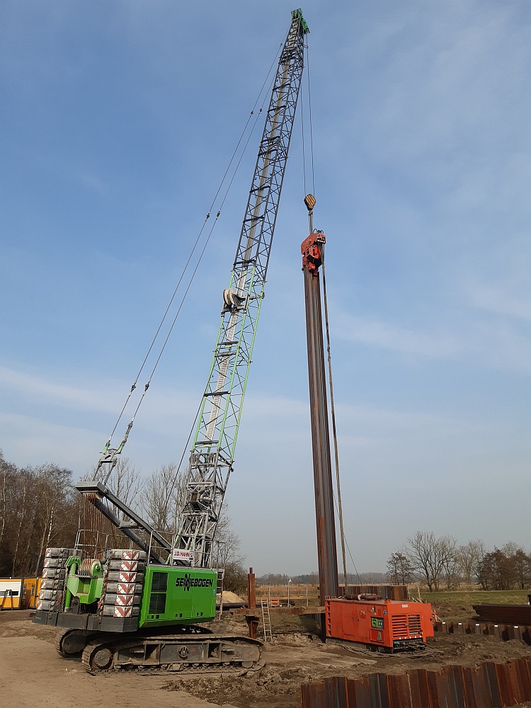einrammen Bei Bedarf können wir auch auf diesen Sennebogen 690 zurückgreifen, der als Kran und im Greiferbetrieb eingesetzt werden kann. Die maximale Auslegerlänge beträgt 47 m. |