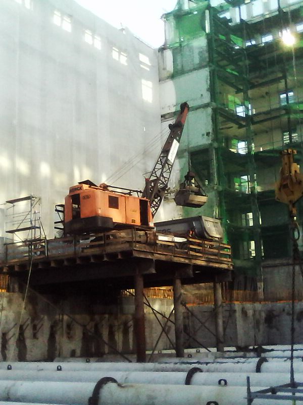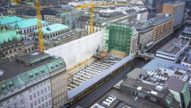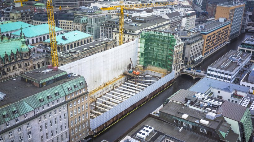 Hamburg Zentrum, 2016 Ausbaggern einer dreistöckigen Tiefgarage am Alten Wall. Aushubtiefe 18 Meter mit Direktverladung in LKW. |