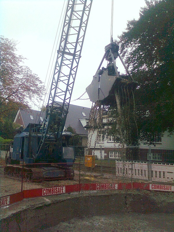 Hamburg-Marienthal, Oktober 2013 Ausbaggern von Start- und Zielschacht eines Abwasserrohr-Bohrers. |