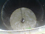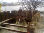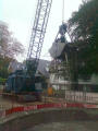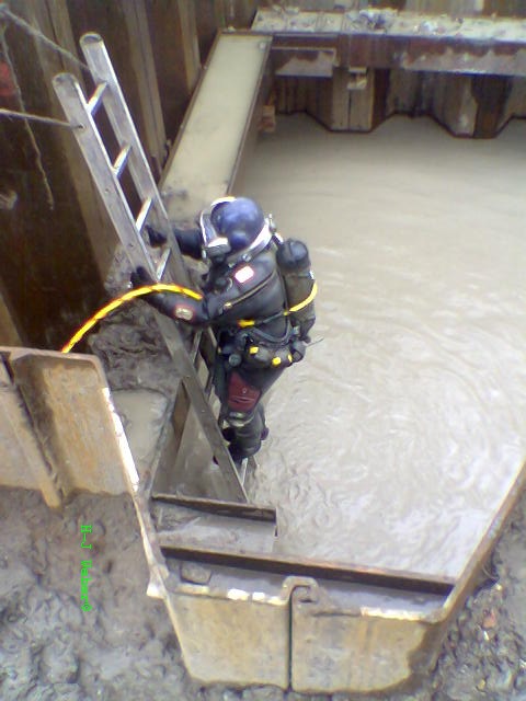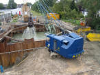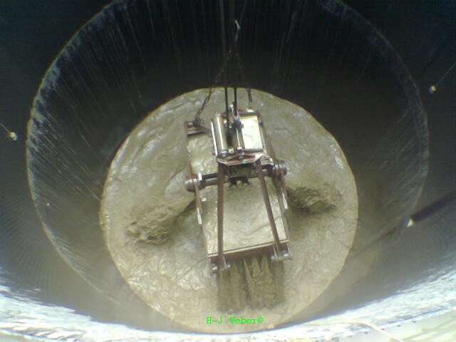 Meißelarbeiten in Hamburg Wandsbeck, Juni 2009 Um ein drei Meter dickes Betonrohr in neun Metern Wassertiefe zu zerlegen, wird der M 90 mit einem Fallmeißel eingesetzt. |