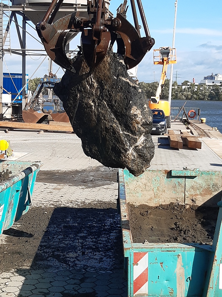 Hamburg, September 2021 Nach dem Abriss und anschließenden Neubau einer Kaimauer müssen die letzten Trümmerreste nachträglich geborgen werden. |