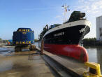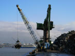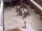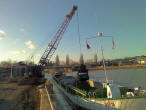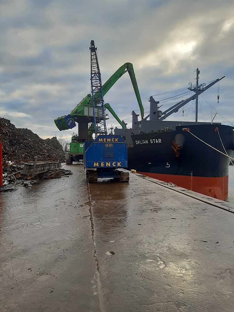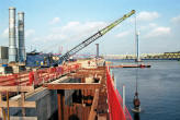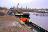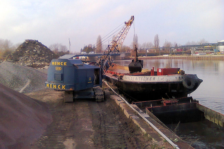 Umschlagarbeiten mit Binnenschiffen in Hamburg Billbrook, Februar 2009 "Berta" hatte den schwierigeren Job: Durch fünf Zentimeter dickes Eis musste sich das Binnenschiff an den Liegeplatz heran arbeiten. Der M 90 hat beim Entladen keine Probleme mit der Witterung. |