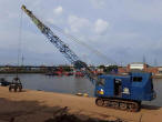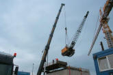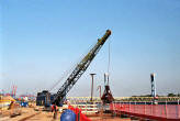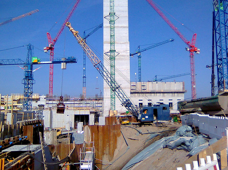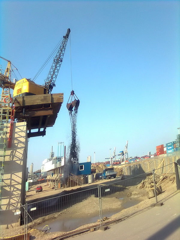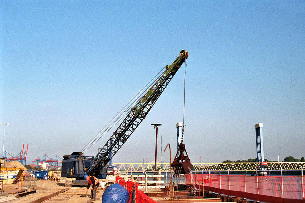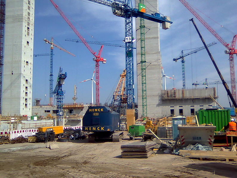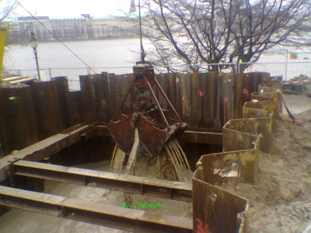 Hamburg, April und September 2009 Neben den Gittermasten der vielen Turmkräne wird auch unser M 90 beim Bau eines neuen Kraftwerks in Hamburg benötigt. Die beiden rechten Bilder vom September 2009 zeigen Arbeiten an der Uferseite des neuen Kraftwerks. In 22 Metern Tiefe muss gebaggert werden. |