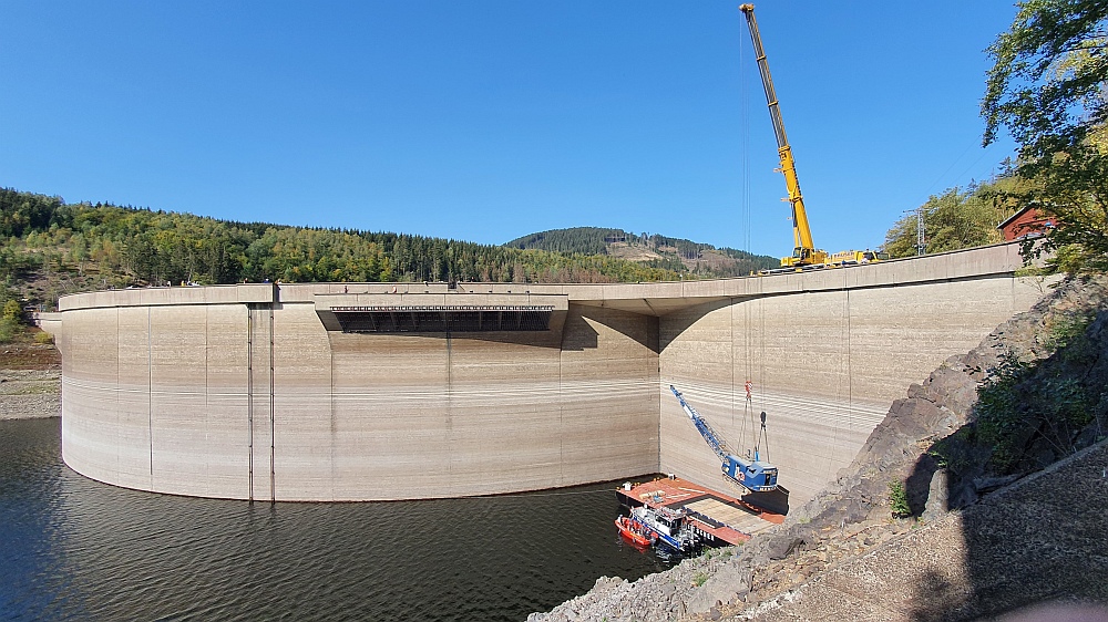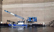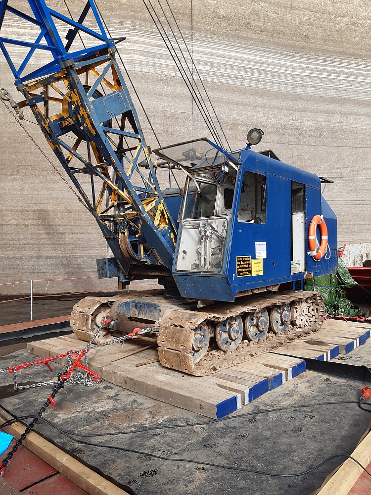 Okertalsperre Altenau, Oktober 2020 Zu Reparaturareiten an einer Dichtfuge muss zunächst abgesunkenes Treibholz weggebaggert werden. Dazu wird der M 90 mit einem Autokran 30 m tief auf einen Ponton abgesetzt, um dann aus 25 m Wassertiefe das Treibholz zu entfernen. |
