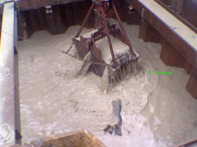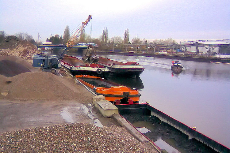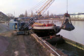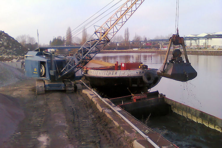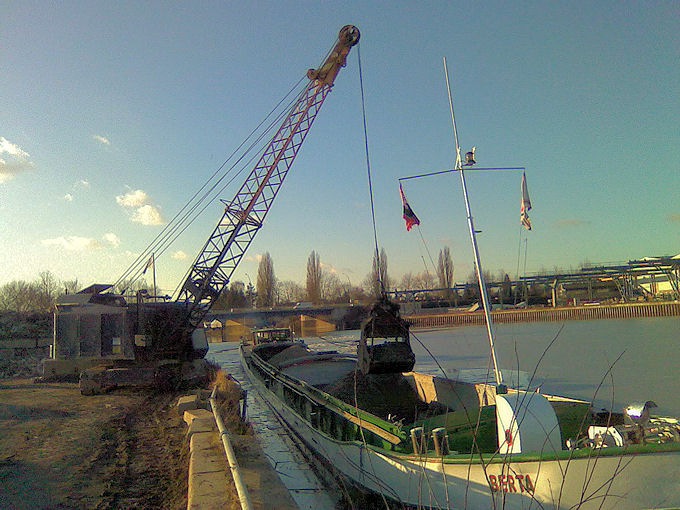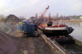 Umschlagarbeiten mit Schuten in Hamburg Billbrook, Dezember 2009 Im Auftrag des Strom- und Hafenbauamtes wird Schlick von kleinen Schuten in größere Einheiten umgeladen. |
