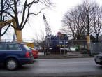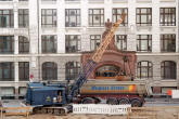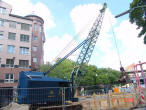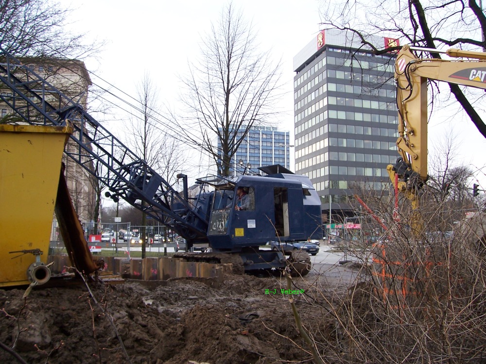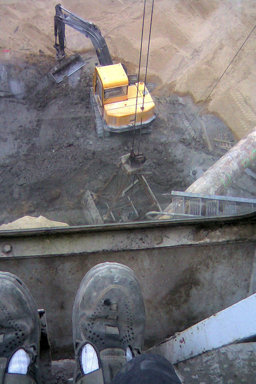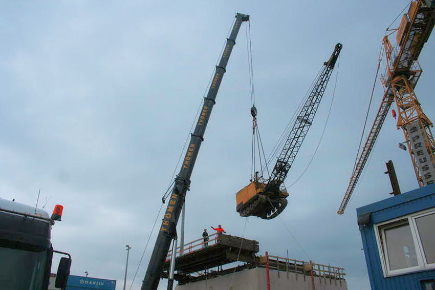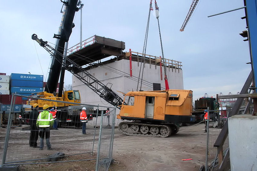 Hamburg, Frühjahr 2010 Spektakulär war der Einsatz eines M 90 auf einem extra konstruierten Balkon, um die Betonkonstruktion durch schrittweises Abbaggern in der Erde zu versenken. |