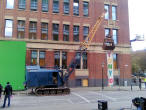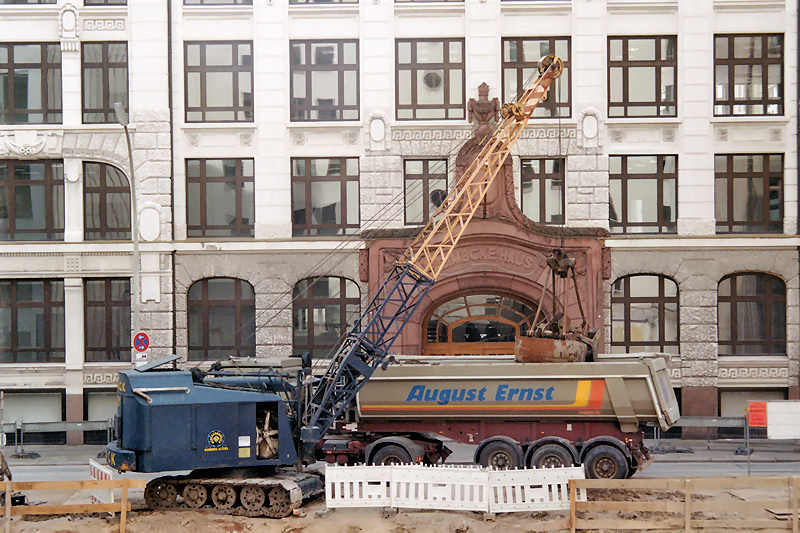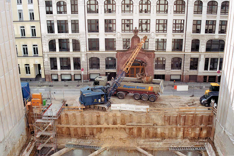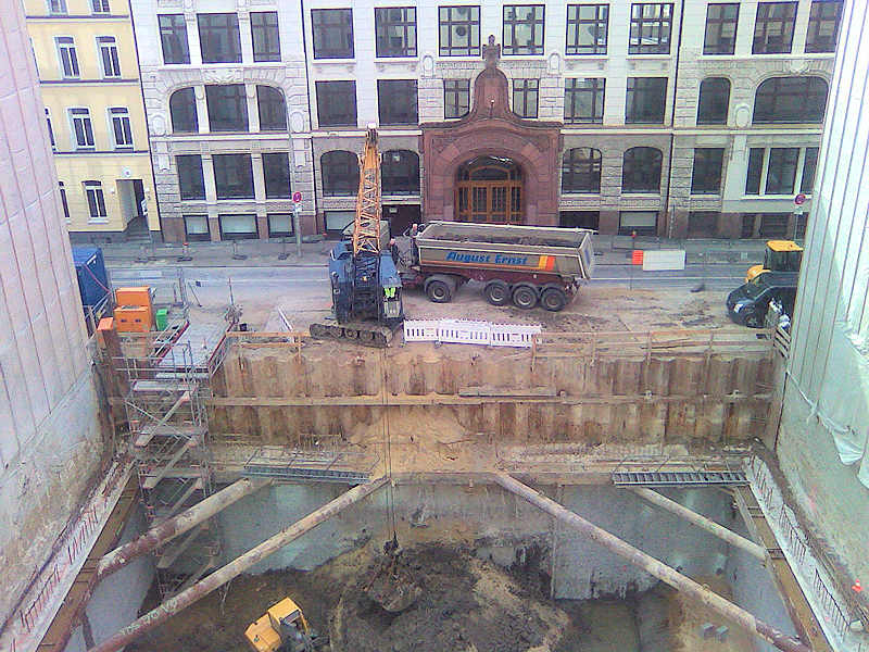 Ausschachtung in Hamburg, August 2009 Zwischen vorhandenem Baubestand muss der Aushub für eine Tiefgarage aus 11 Metern Tiefe herausgebaggert werden. |