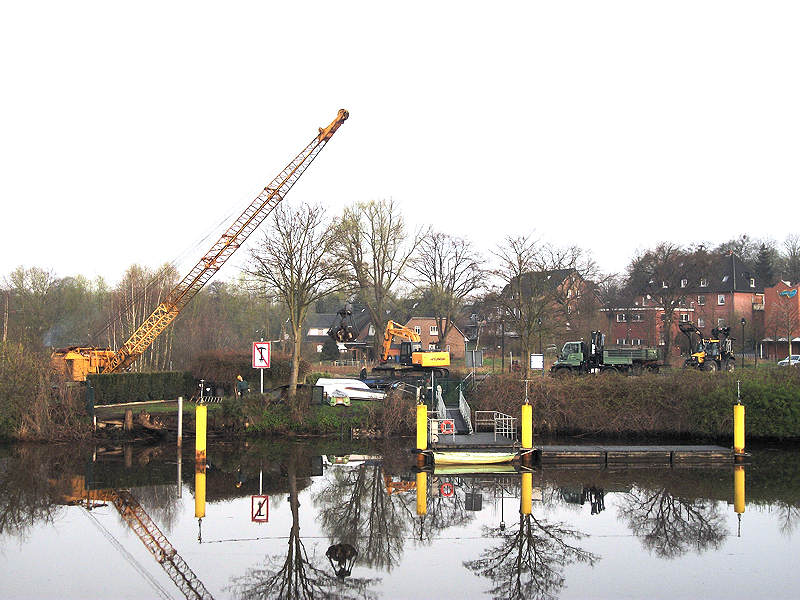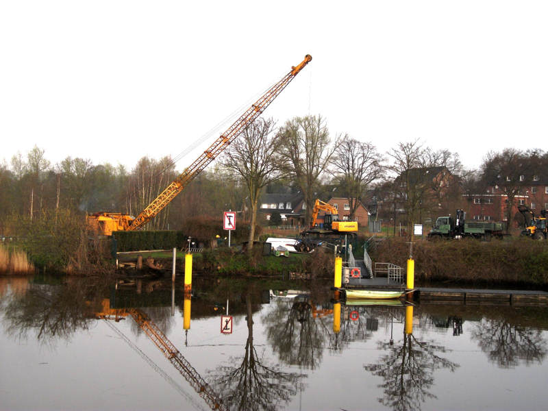 April 2012 Beim Setzen von gut 100 Tonnen Böschungssteinen in Ritterhude war ein 23 m Ausleger nötig, um die am Ufer stehenden Bäume nicht zu beschädigen und die Steine gezielt abzusetzen. |